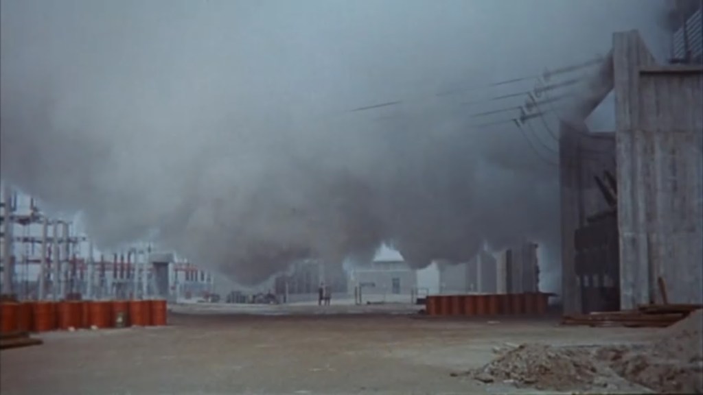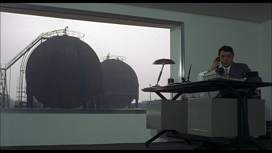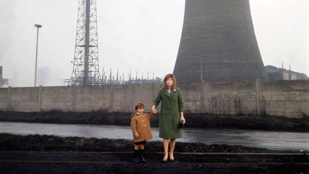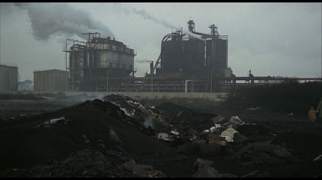 Red Desert, too, portrays the Boom as a process of decay and destruction. The Ravenna in Red Desert is a toxic landscape, aesthetically sublime, but physically wretched. The Boom brought economic prosperity and material abundance– witness Monica Vitti’s elegant wardrobe, and the beautiful, modern, well-appointed bourgeois domestic spaces that Vitti inhabits — but at great cost. Ravenna’s shoreline and water, polluted with industrial effluence, appear either covered in black crude oil, or tinted in lurid, unnatural colors. In the movie’s final scene, Vitti’s character, Giuliana, takes a walk with her son outside of her husband’s factory. Valerio points at the factory’s smokestacks, belching yellow smoke, and asks his mother why the smoke is yellow. Giuliana tells her son that the smoke is yellow because it is toxic, and Valerio replies, “Then if a little bird (uccellino) flies through it, it will die.” No, Giuliana tells her son, “By now the little birds know that, and they don’t pass through it anymore.”