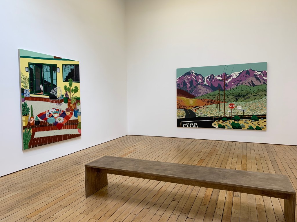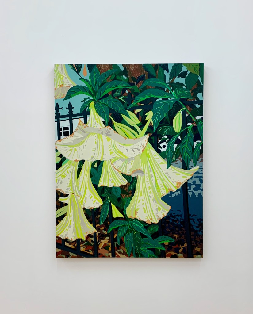 If I were to buy just one painting from the Hilary Pecis show at Rachel Uffner, it would be Angel Trumpets. It reminds me just enough of “home”–if by “home,” I mean “warmer places where I have lived,” or, interchangeably, Taiwan or California–but not so much that gazing at it threatens to destabilize me with longing or nostalgia.