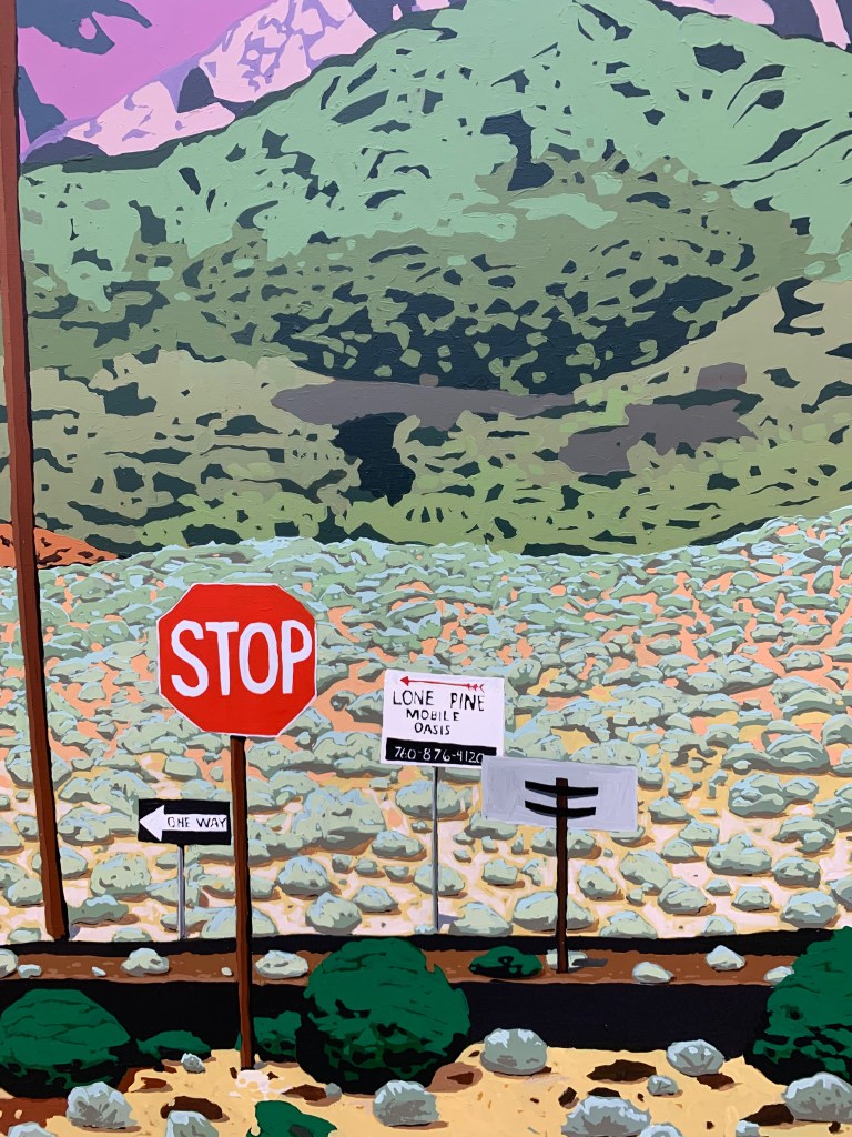 I gasped when I saw Pecis’s painting of Mt. Whitney. I thought, I know exactly where that photograph was taken. I’ve been up and down 395 so many times. That’s the cut-off for Lone Pine.
