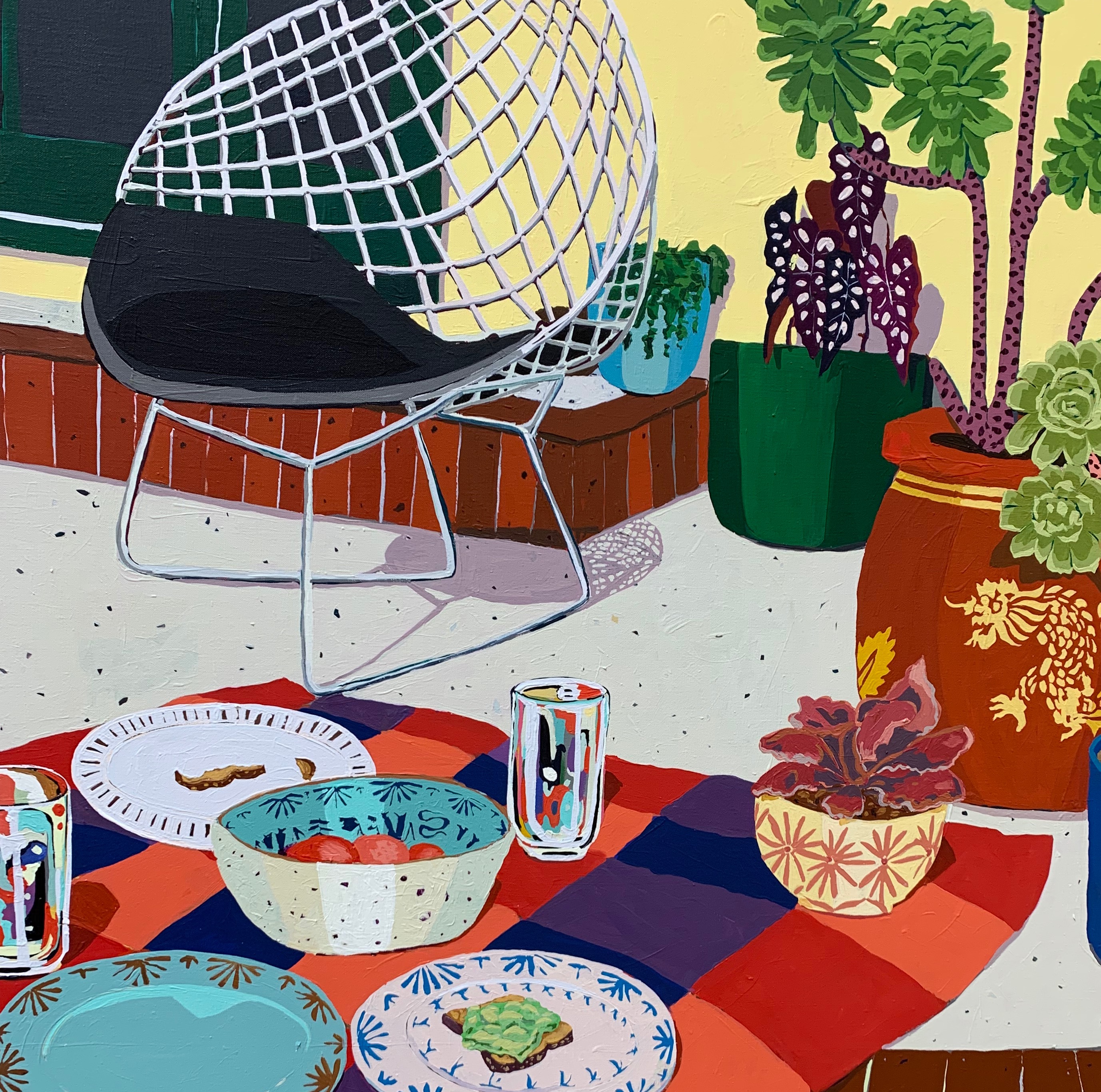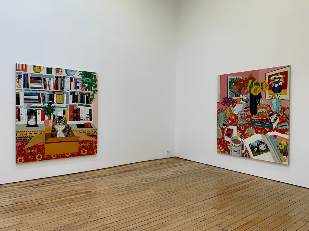Part of the pleasure of looking at these paintings lies in the way they play with the tension between the photographic and the painterly. Pecis begins with snapshots, and the paintings retain the peculiarity of photographic “vision,” which is so different from human vision, but they are also unabashedly painterly. Get close to these paintings, and you can see the way Pecis plays with chromatic and material possibilities of paint. Her paintings sometimes remind me of Wayne Thiebaud, another California painter, both in the handling of paint and in the way that the edges of her objects often shimmer and dissolve into borders of color.