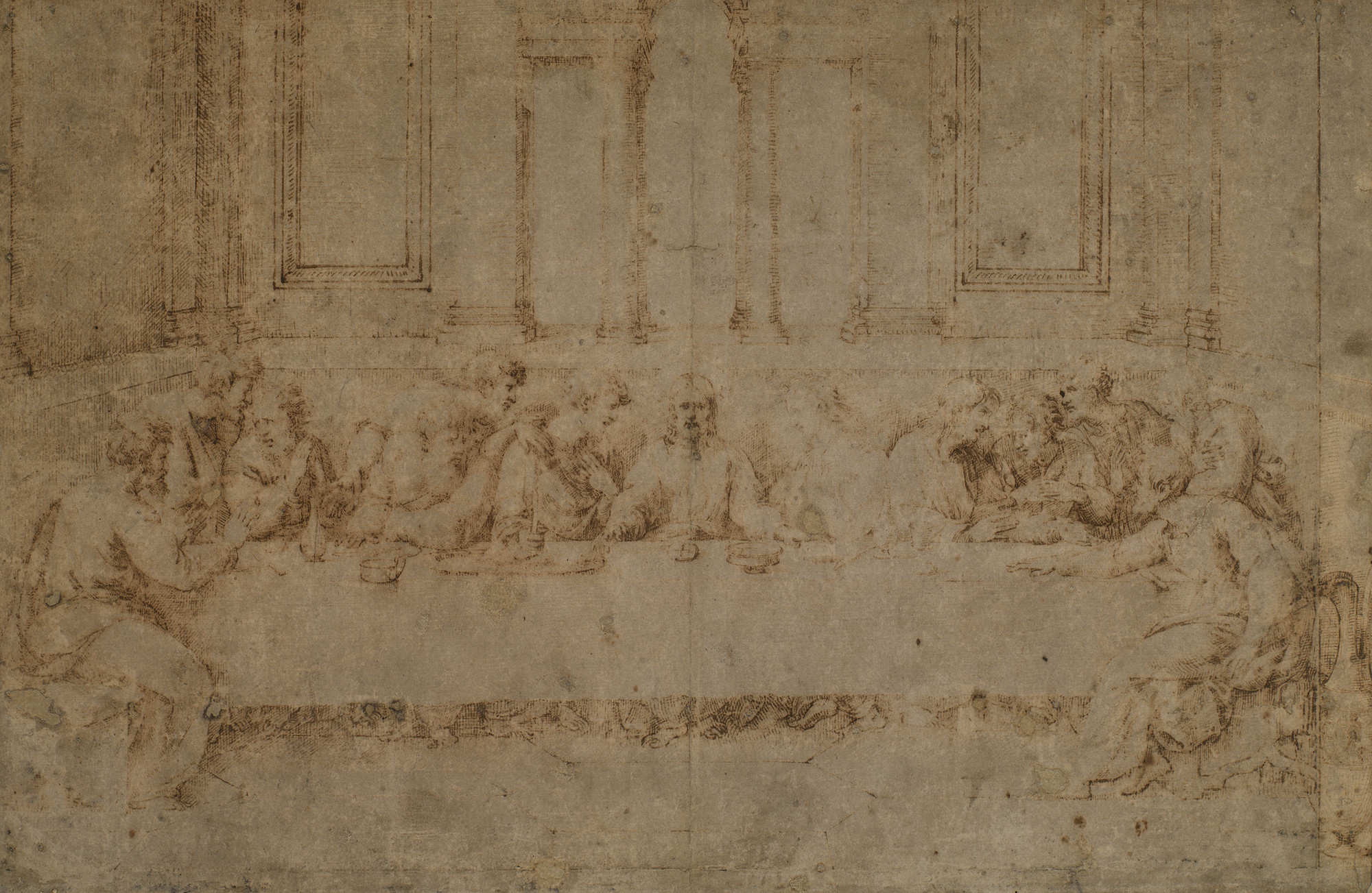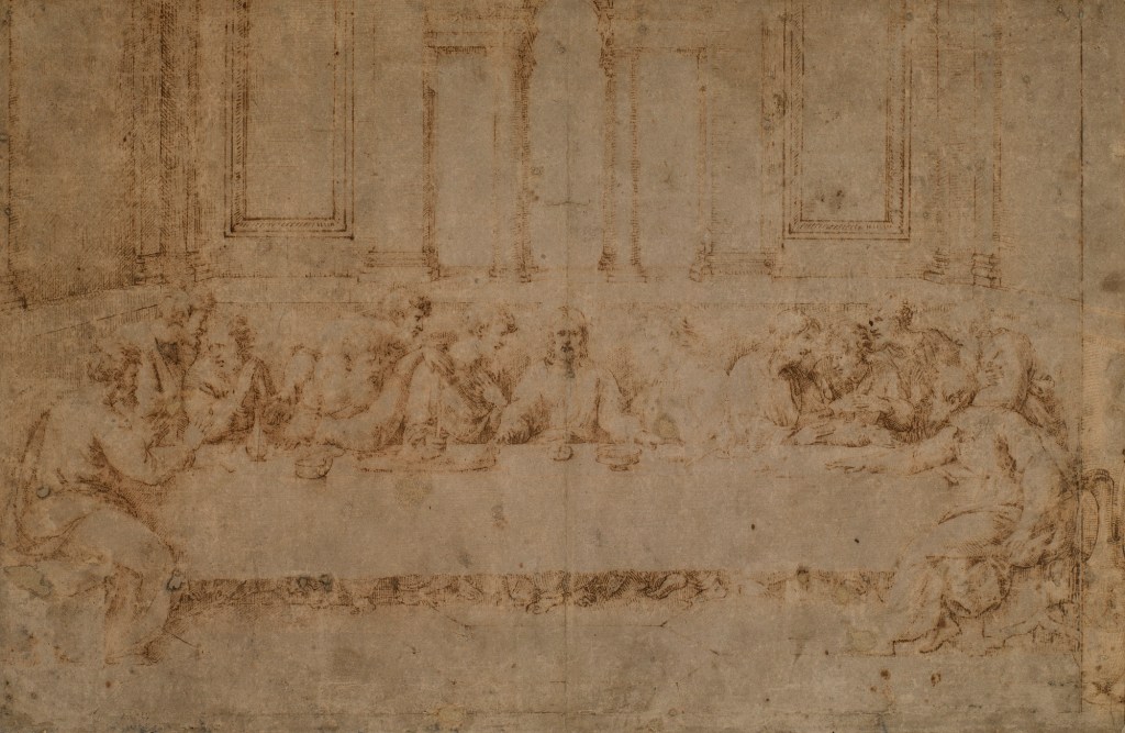 Pen and ink with stylus lines and pointing; the outlines indented; badly faded, the paper discoloured and abraded. Watermark of an anchor in a circle, surmounted by a 7-point star. | 30.6 x 46.5 cm (sheet of paper) | RCIN 912745 https://www.rct.uk/collection/912745/the-last-supper
