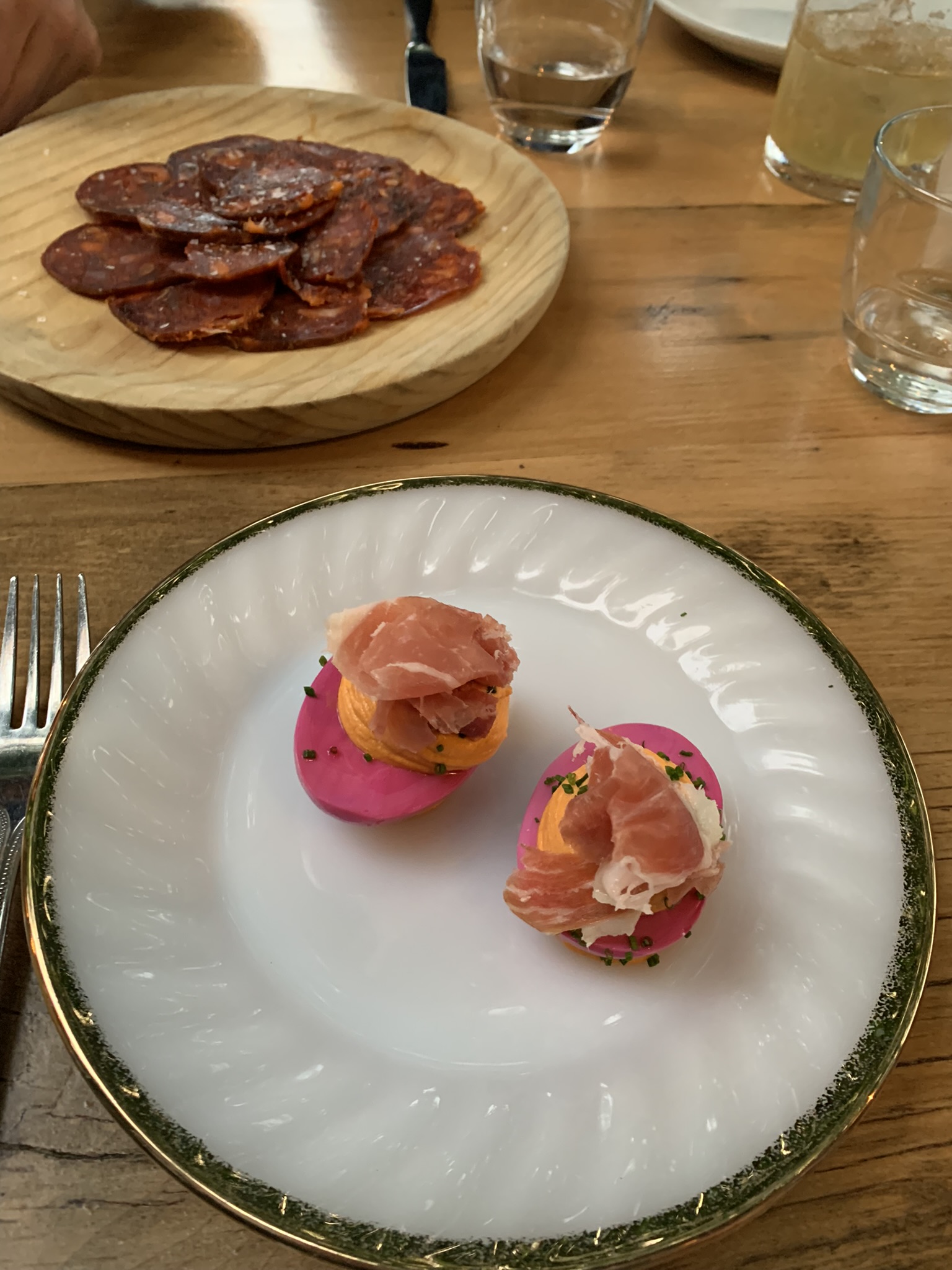 We still ate our way across Portland. We had a long, leisurely, and very fun dinner at Chaval, where the staff was warm, hospitable, and indulgent. Our server didn’t even blink when my husband ordered a hamburger for dessert. (Probably because I ate more than half of his “dinner” burger.) The burgers are very good, so if you read this and decide that you, too, want to have a burger for dessert, know that none of us will judge you for this choice. Chaval’s tapas-style small plates showcase local ingredients. A surprise hit: the beet-pickled deviled eggs, which came topped with a slice of jamon.