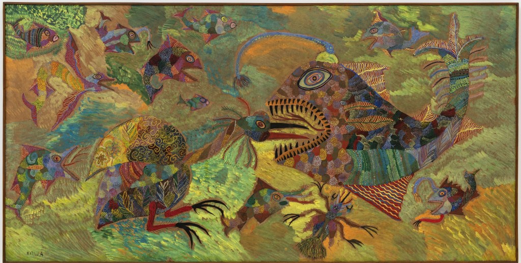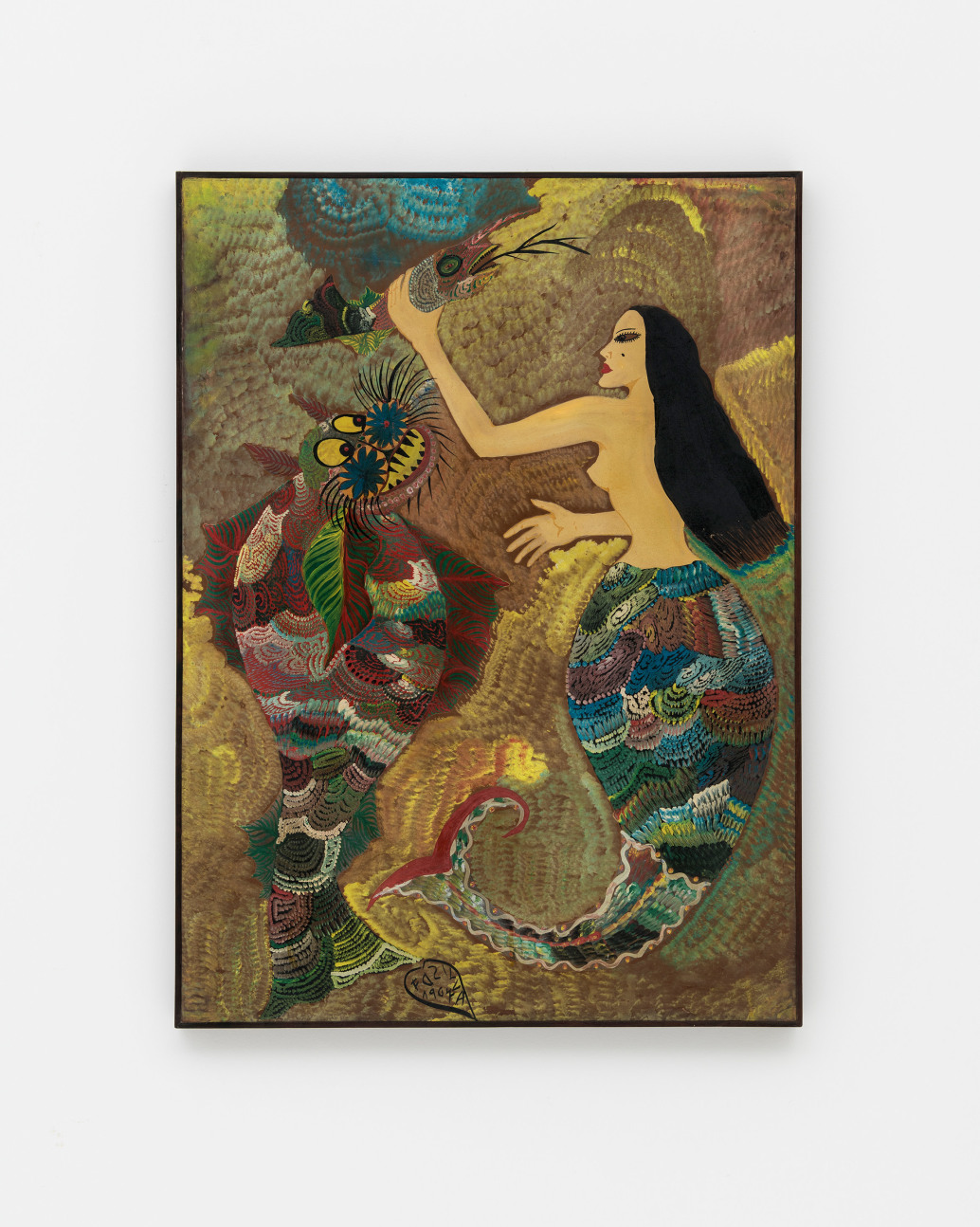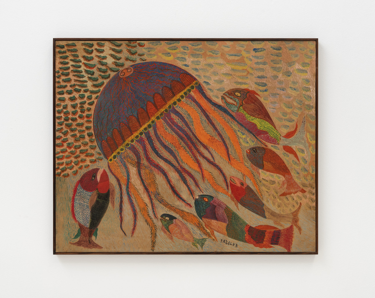 Chico da Silva (Galatea Galerie) – joyful, rich paintings that embody a particular kind of tropical modernism. These would look at home alongside designs by Roberto Burle Marx. According to Gabriella Angeleti, “Chico [da Silva] Chico was born in 1910 to an Indigenous Peruvian father and a mother from Ceará in northeastern Brazil. His childhood was spent in the Amazon rainforest before the family relocated to Quixadá, where his father died after being bitten by a rattlesnake. Chico eventually settled in the slums of coastal Fortaleza, where [the Swiss critic and curator] Jean-Pierre Chabloz found his murals.”