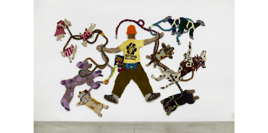 Angela Nguyen (Albertz Benda) – Angela Nguyen’s tenderly funny flattened dog walker framed by a constellation of dogs. The work, titled A Gig’s A Gig, was installed on the floor at the Armory.