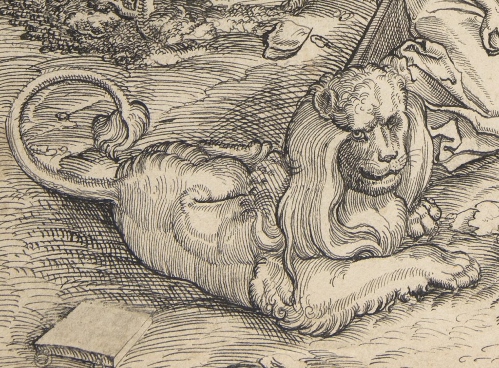 Other moments of deviation happen when Amman can’t quite master the technique necessary to make a convincing copy. His effort is palpable. Some of these details betray Amman’s inexperience (look at Jerome’s hands, also look at the awkwardness of the Christ figure’s draperies and halo, and Amman’s version of Christ’s face, so unconvincing). At this stage, Amman still has a lot to learn about rendering musculature and anatomy. Just look at his lion: