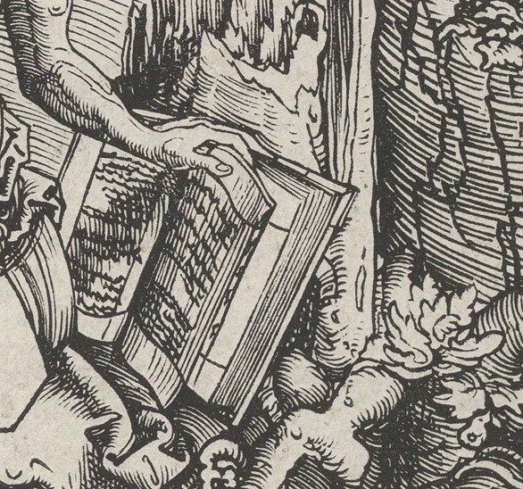 Some of Amman’s deviations from Cranach’s original appear to be unconscious, or accidental. Some departures from the model occur where Amman loses himself to the pleasure of drawing in pen and ink, and departs from the exercise of trying to emulate the look, feel, and line quality of a woodcut.