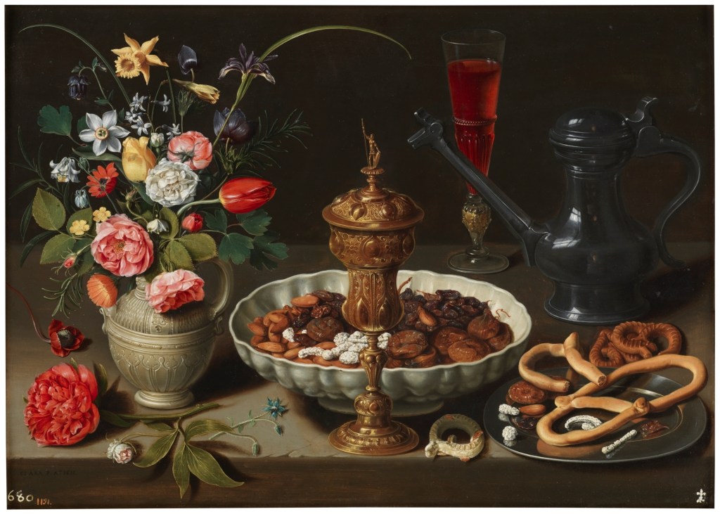 Clara Peeters, Still Life with Flowers, a Silver-gilt Goblet, Dried Fruit, Sweetmeats, Bread sticks, Wine and a Pewter Pitcher, 1611. Collection of the Prado Museum, Madrid.