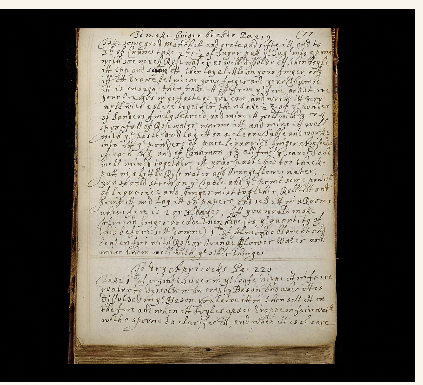 Take some good manchett and grate and sifte itt and to 3 load of Crums take 2 load pint 1/4 of sugar putt ye Suger into a pann with soe much Rosewater as will dissolve itt, then boyle itt upp and scum itt, then a lay a little on your finger, and iff itt drawe betweene your finger and your thumbe itt is enough, then take itt off from your fire, and stirre your Crumbs in as fast as you can, and work itt very well with a slice together, then take 1/2 ounce of your powder of Sanders finely searced, and mixe itt well with 3 or 4 spoonfull of Rosewater, warme itt, and mixe itt well with ye paste and lay itt on a cleane Table and worke into itt ye powders of pure liquorice Ginger Anisseeds of each 2 ounce and of Cinnamon 1 ounce all finely [s?]earced and wellmixed together, iff your paste bee too thicke putt in a little Rosewater and Orangeflowerwater, you should strew on ye Table and ye print some powdered licquorice and Ginger mixt together, Roll itt and print itt and Lag itt on papers, and sett itt in a Roome where fire is for 3 dayes. Iff you would make Almond Ginger breade then adde to ye quantity of this before sett downe, 1 [??unclear??] of Almonds blancht and beaten fine with Rose or Orange flower Water and mixe them well with ye other things.