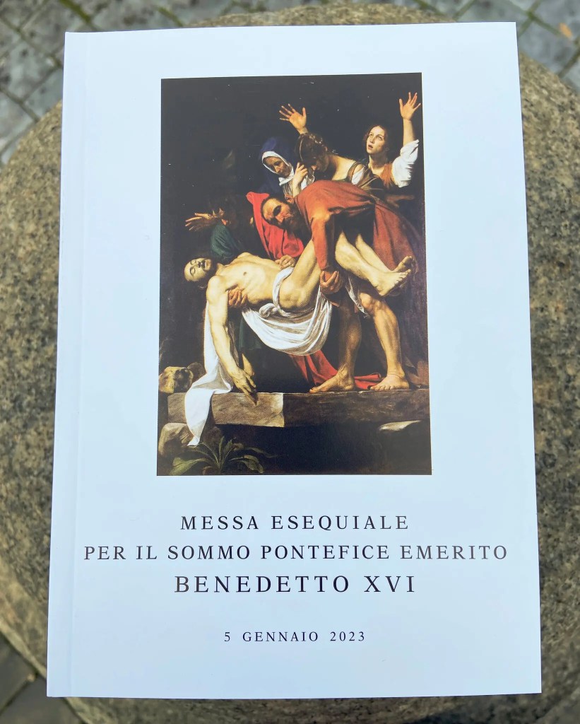 I don’t know who chose the image that ended up on the cover of the program for Benedict’s funeral mass, but it is an image that echoes and responds to Michelangelo’s portrayals of Christ. Like Michelangelo, whose Pieta he surely knew well, Caravaggio’s Deposition of Christ (1602-1603) emphasizes Christ’s mortality, his humanity, and above all, his fleshly corporeality.