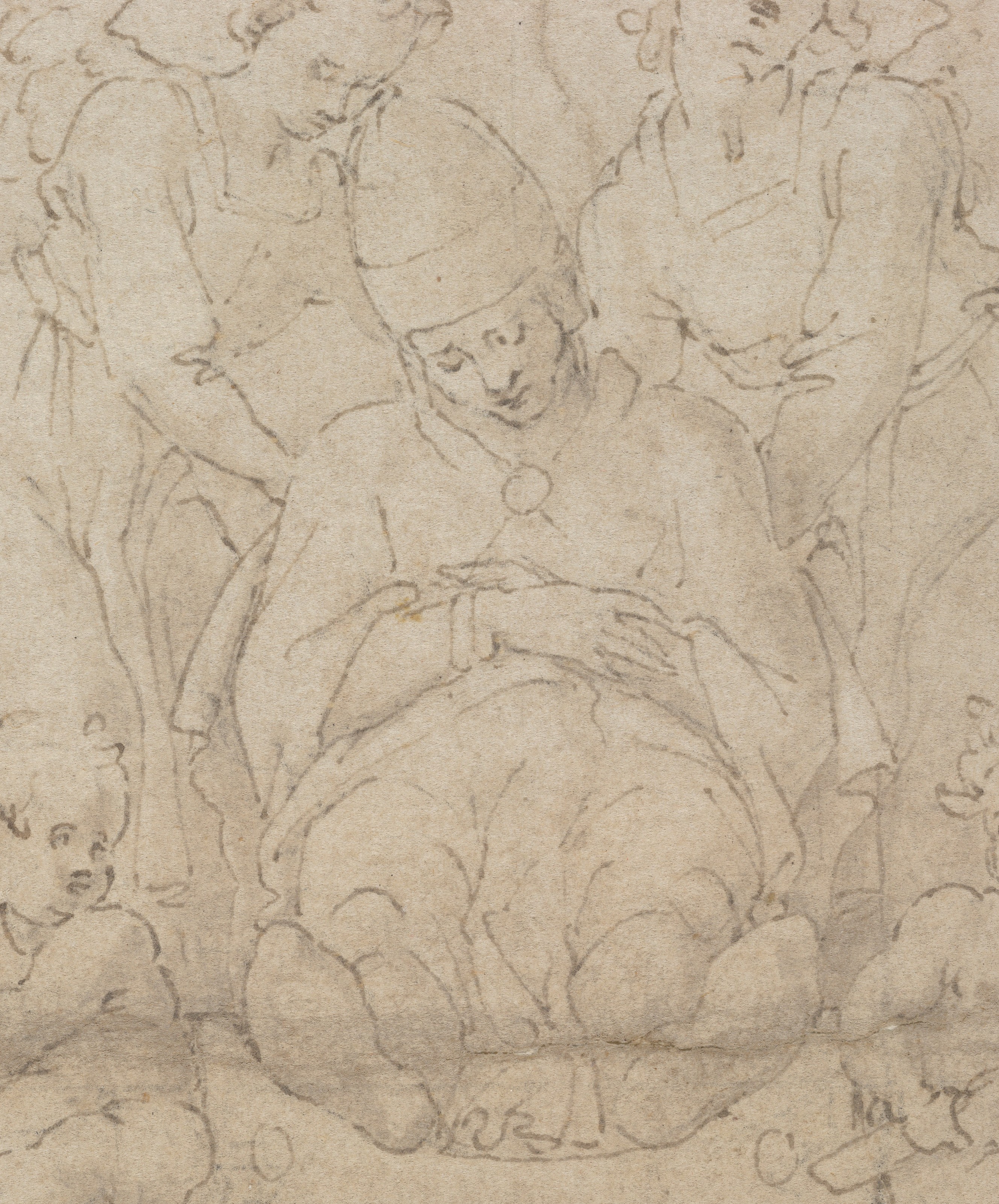 The drawing centers on the figure of the Pope, his eyes shut as in sleep—or death. It is a beautifully tender drawing, with Julius looking all too human, reminiscent of the tradition of emphasizing Christ’s earthly mortality in portrayals of the Lamentation of Christ.